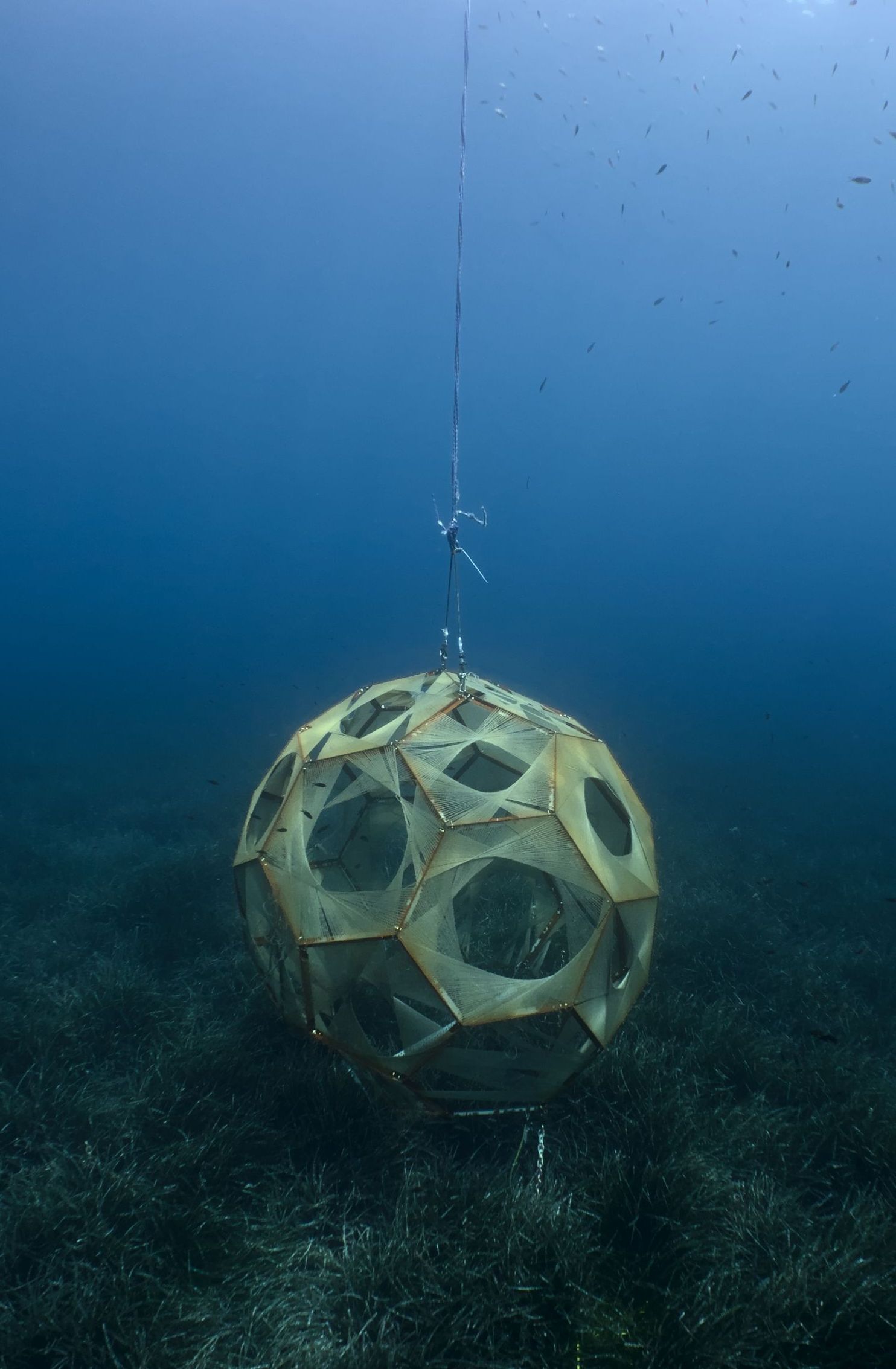 The structure was created through the engagement of various participants who all contributed to its realization. At the pier of the scientific research station, marine biologists, divers, and even children were involved in weaving and assembling the large-scale prototype. The process could be described as a way of »weaving together« - as a shared co-design experience for the participants to literally weave together, but beyond that, the work interweaves the biological with the sociological dimension. After »Kiki’s« immersion in the bay, supported by a team of six divers and a boat, the structure was anchored at minus 10 meters and connected to a solar panel on land.