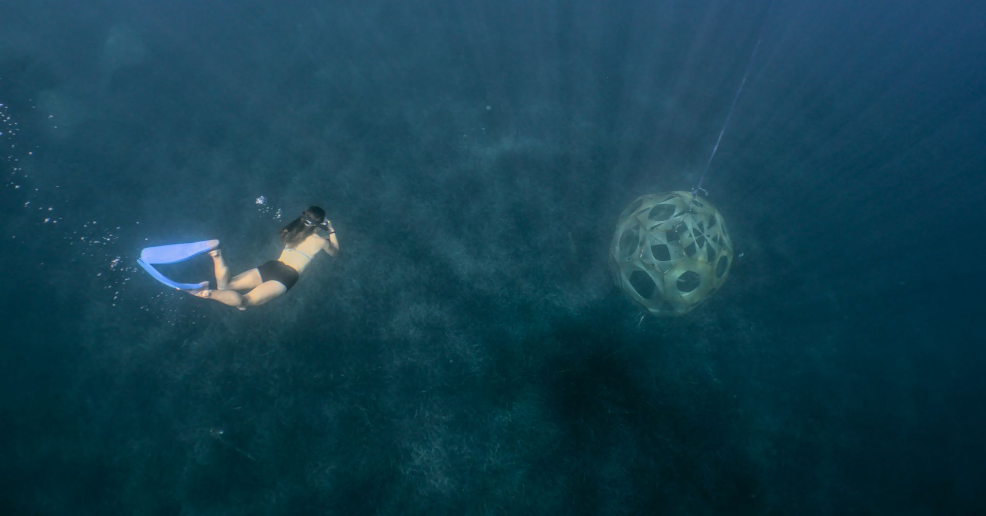 CREDITS: Kiki reef prototype in STARESO. rasaweber.com. Photo: Stéphane Jamme, @stepp_aquanaute. Diver: Noemie Chabrier. Location: STARESO (FRR), 2023.